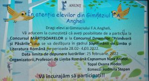 Уважаемые ученики, приглашаем Вас поучаствовать в конкурсе Мэрцишоров и в Конкурсе рисунков на тему»Весна и Птицы»в рамках недели Румынского языка и литературы.Вы можете принести свои работы до 25 февраля.Ждем ваши работы!!